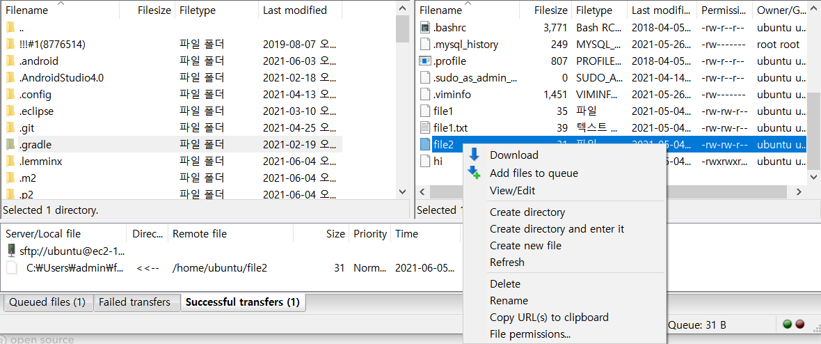 간단하게 우분투 서버에 있는 file2라는 파일을 로컬로 이동시켜보겠습니다.
