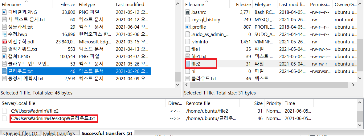 반대로 로컬의 파일을 서버로 upload해보겠습니다. 클라우드.txt파일을 전송 시, 아래처럼 서버에 잘 저장되었음을 알 수 있습니다.