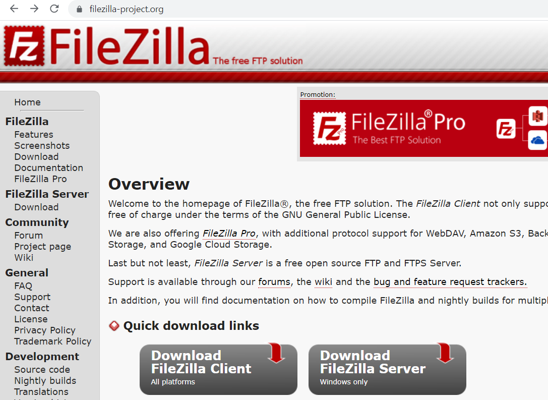 Overview Welcome to the homepage of FileZilla®, the free FTP solution. The FileZilla Client not only supports FTP, but also FTP over TLS (FTPS) and SFTP. It is open source software distributed free of charge under the terms of the GNU General Public Licen
