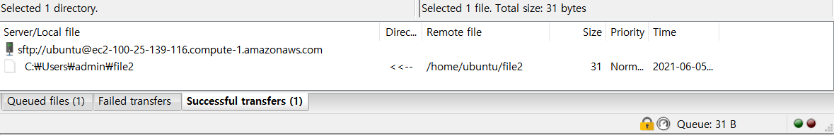 파일의 마우스 우클릭을 통해 Download를 클릭하면 아래 창 처럼 로컬admin디렉토리에 file2가 저장되었음을 알 수 있습니다.