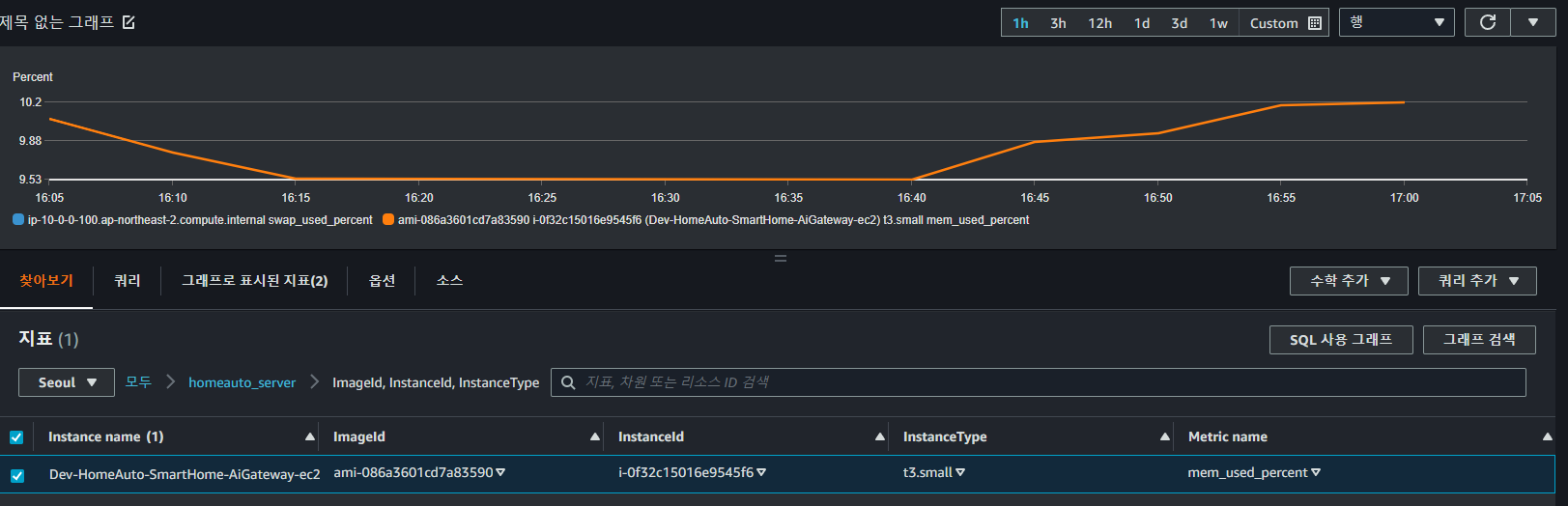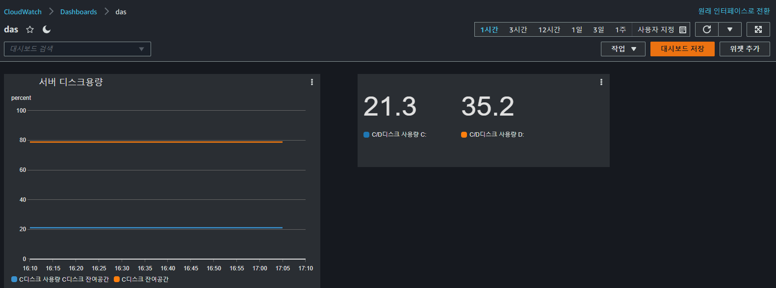 순서: aws cloudwatch 서비스 접속-> 대쉬보드 탭-> 대쉬보드 생성 클릭-> 위젯 추가->metrics정보 출력 확인