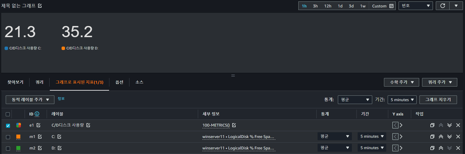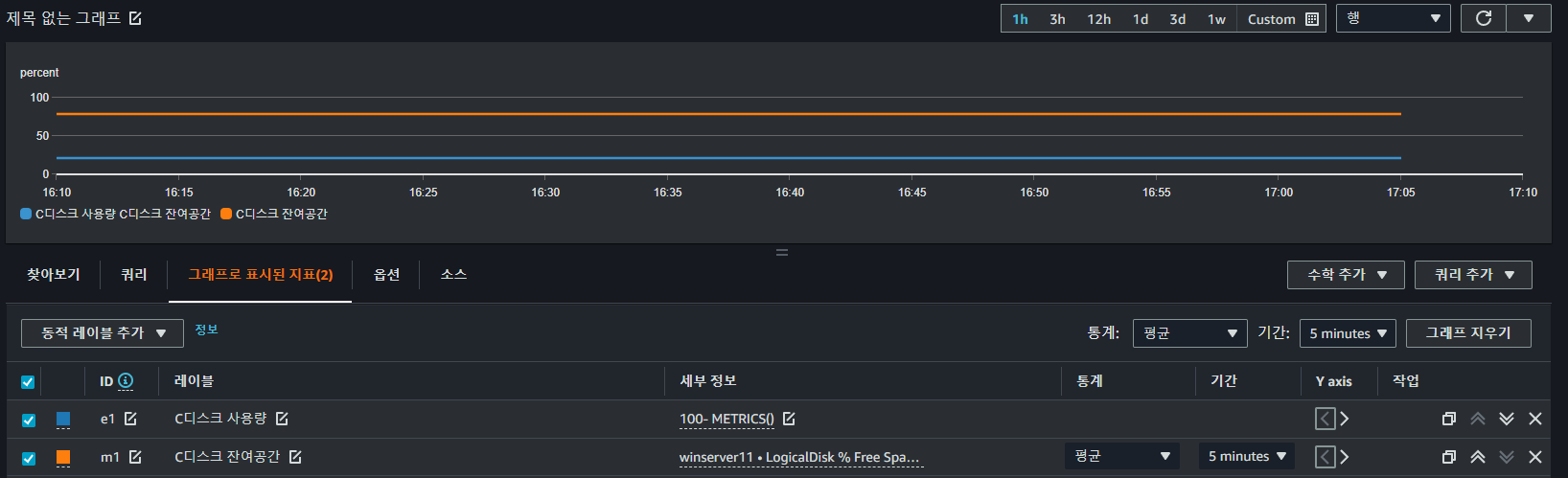 - 참고) disk 정보의 경우 window 서버는 linux서버와 달리 storage의 사용량 정보는 없기 때문에 사용량 정보로 변환하고 싶을 시 "수학 추가" 탭을 통해 아래처럼 식을 조정해야함. METRICS()는 해당 디멘션의 모든 지표들을 나타내고, METRICS(m1)은 m1만을 의미함. 아래 그림의 경우 metric이 하나 이므로 두 표현 모두 같은 의미를 지님.