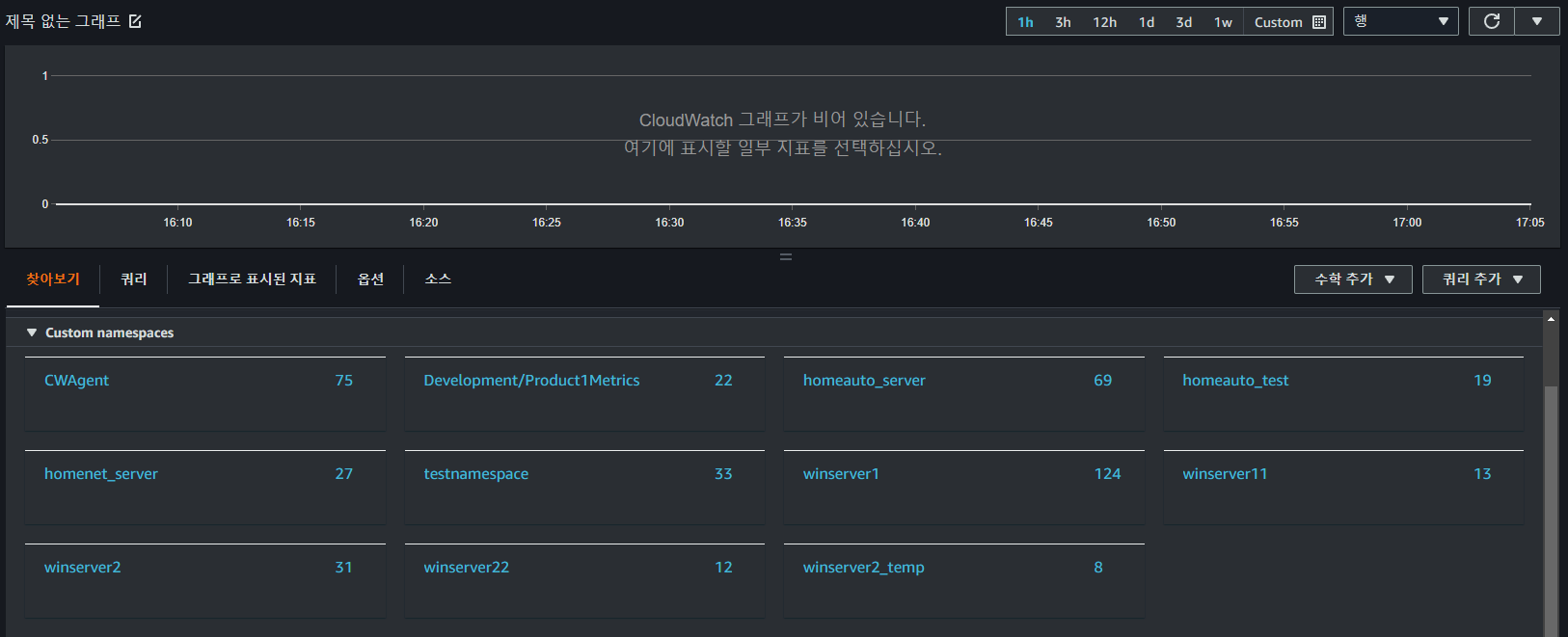 대시보드 생성 페이지에서 우상단 위젯추가 버튼-> 행 위젯 추가-> 지표 클릭 후 아래 그림처럼 namespace 목록이 출력됨.