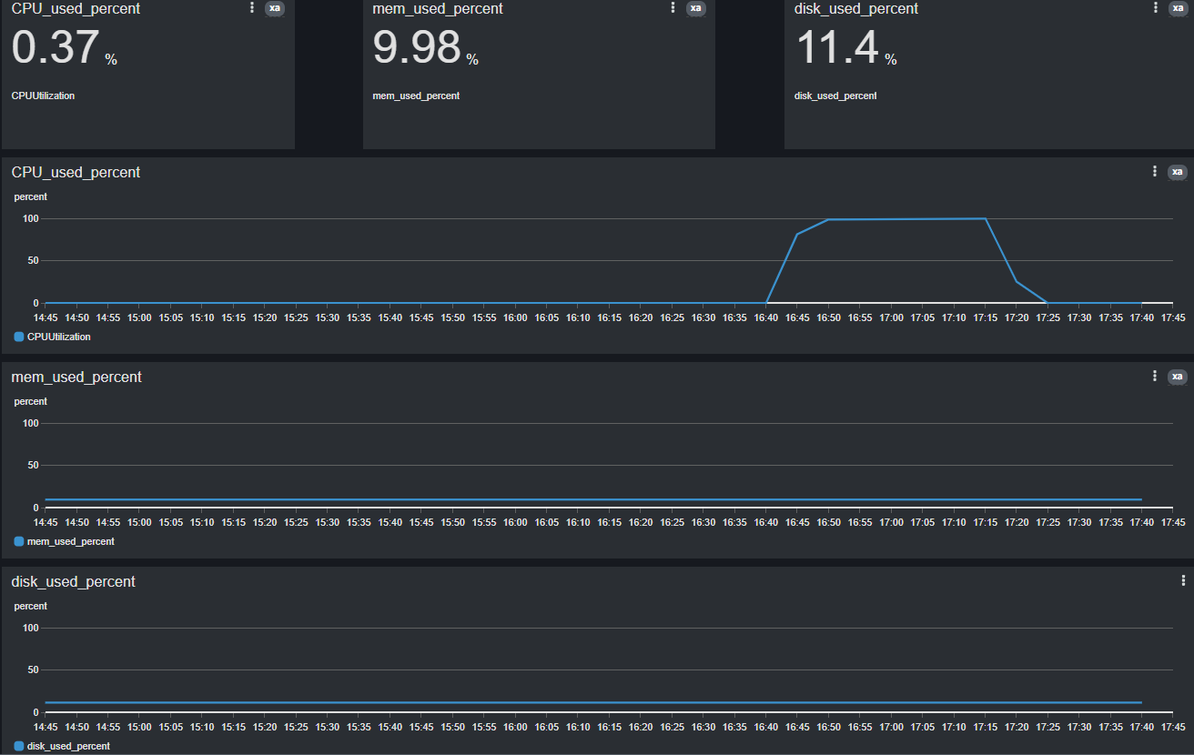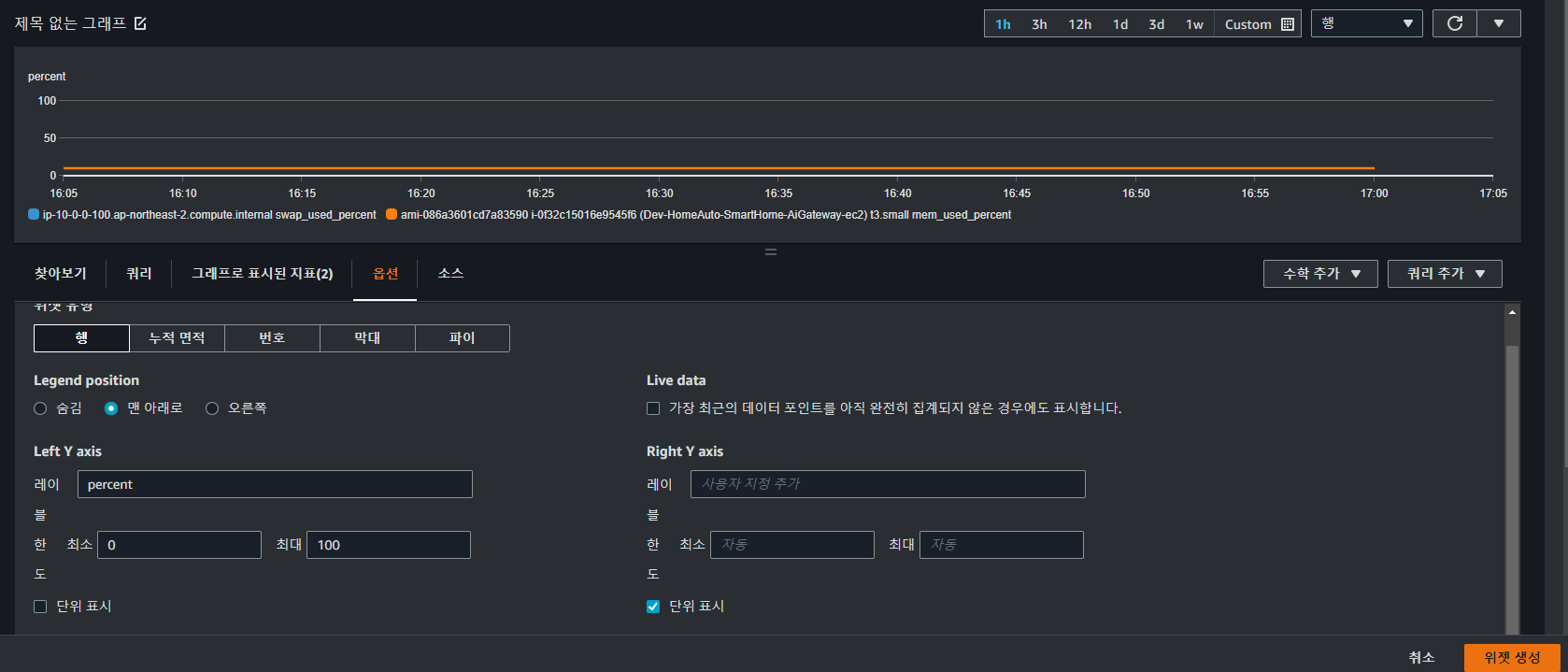 - y축의 퍼센트 수치를 0~100처럼 변경하고 싶으면 옵션 탭-> Left Y axis에서 레이블에 percent입력 후 최소/최대 수치 조정-> 단위 표시해제 후 위젯 생성→ percent로 표현되지 않는 metric 정보를 percent로 그래프에 표현하고 싶을 때 반드시 설정함.