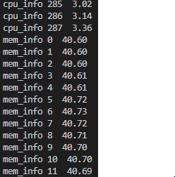 출력: cpu, memory, disk 값이 288개씩 출력됨(24시간 동안 5분단위 데이터 수집: 288개)