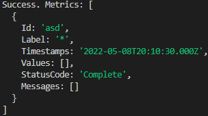 기본적으로 data.MetricDataResults를 stringify한 값을 json으로 파싱하여 출력하면 아래와 같이 나오는데, 위 코드는 문자열로 출력하기위해 values 부분부터 statuscode전까지(=값만 출력) 부분 파싱하여 출력시킨 예제 코드입니다.